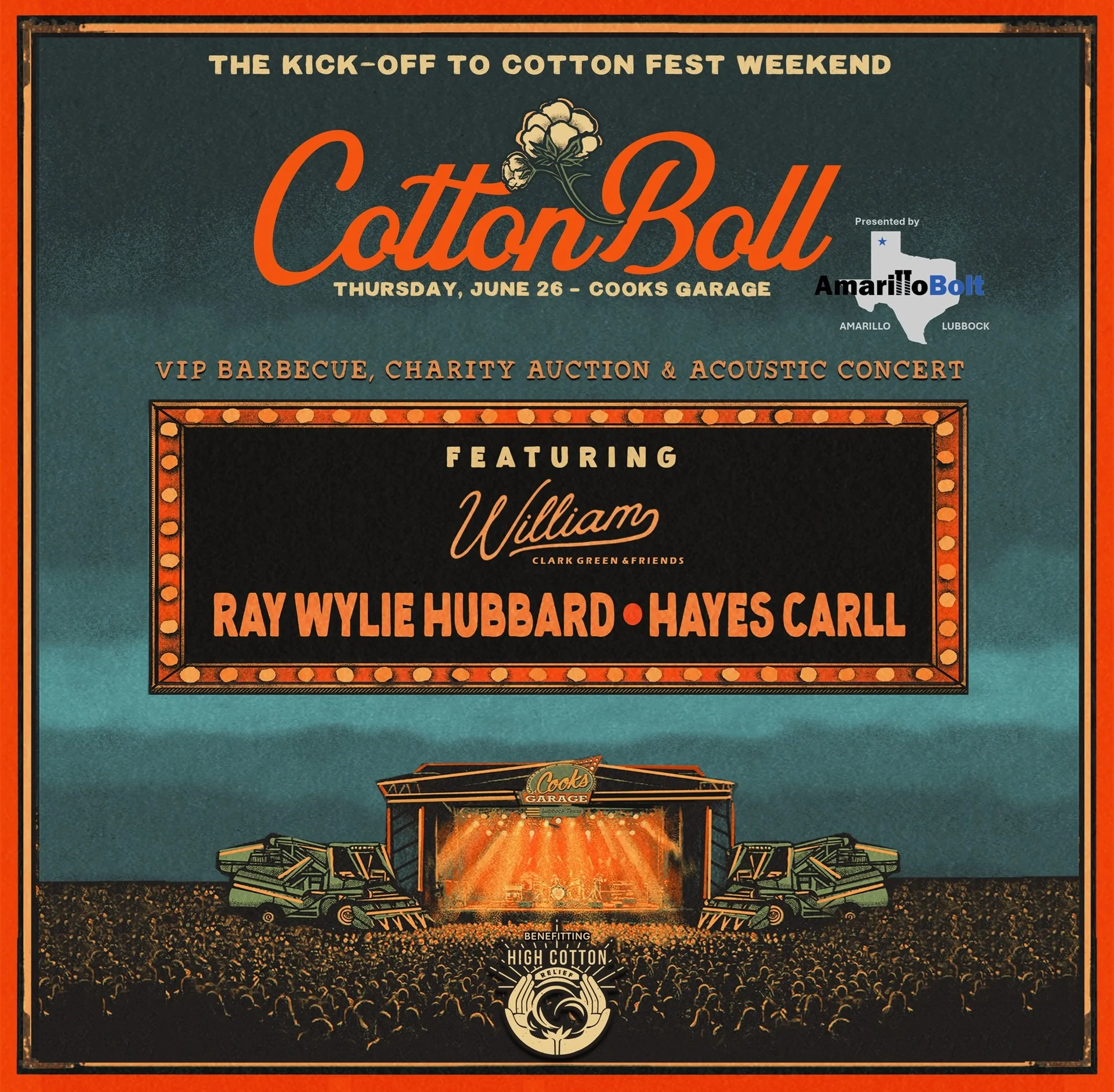 This exclusive event is the kick-off to Cotton Fest and features an intimate acoustic concert with William Clark Green and this year’s guests, Ray Wylie Hubbard and Hayes Carll.